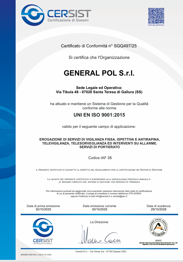 General Pol è un'azienda formata da un team esperto di professionisti che vanta una lunga esperienza nel settore. Si occupa prevalentemente di vigilanza armata, oltre a portierato e servizi integrati di portineria, custodia e tenuta chiavi, gestione teleallarmi e videosorveglianza. General Pol è inoltre specializzata nella programmazione e nella gestione di servizi di pulizia, in ambienti interni ed esterni, sia per utenza pubblica che per utenza privata.